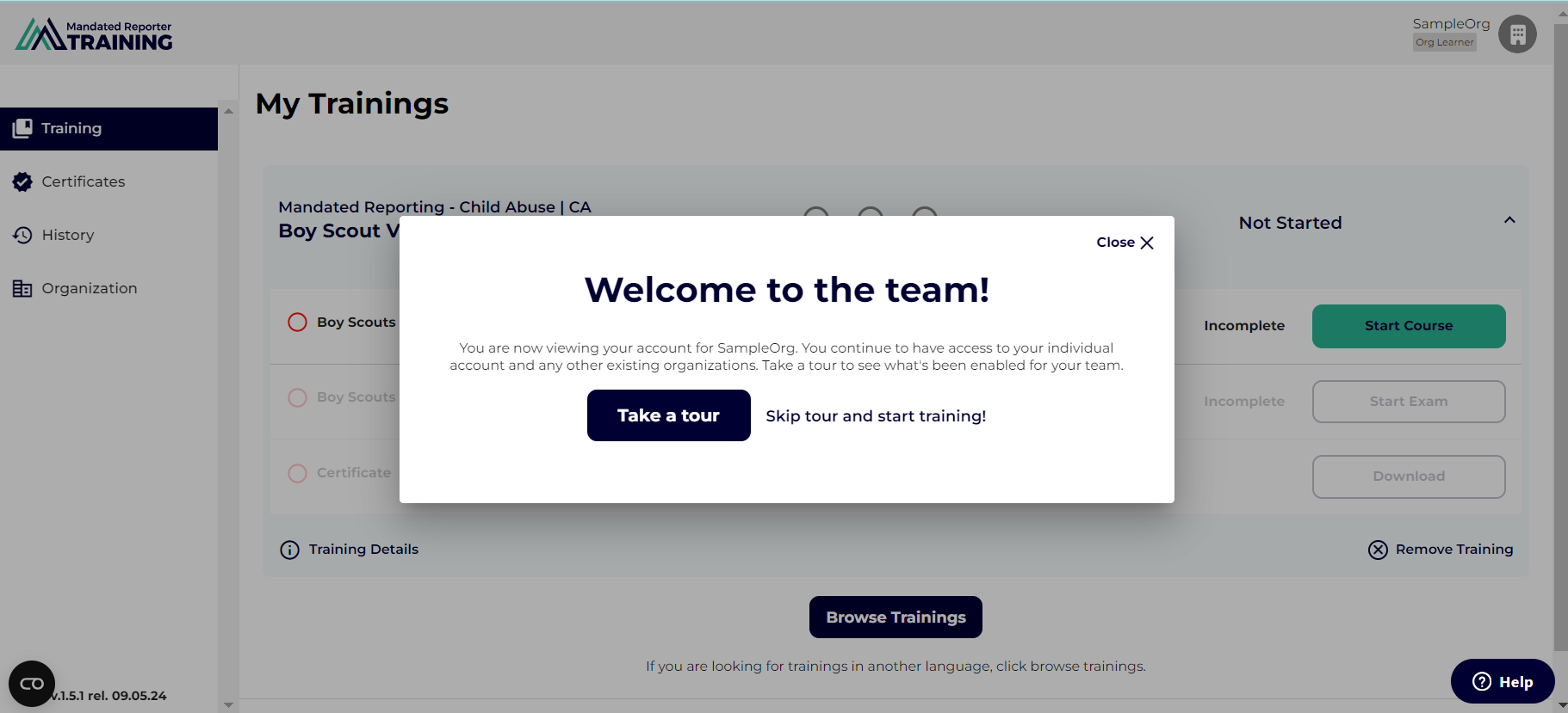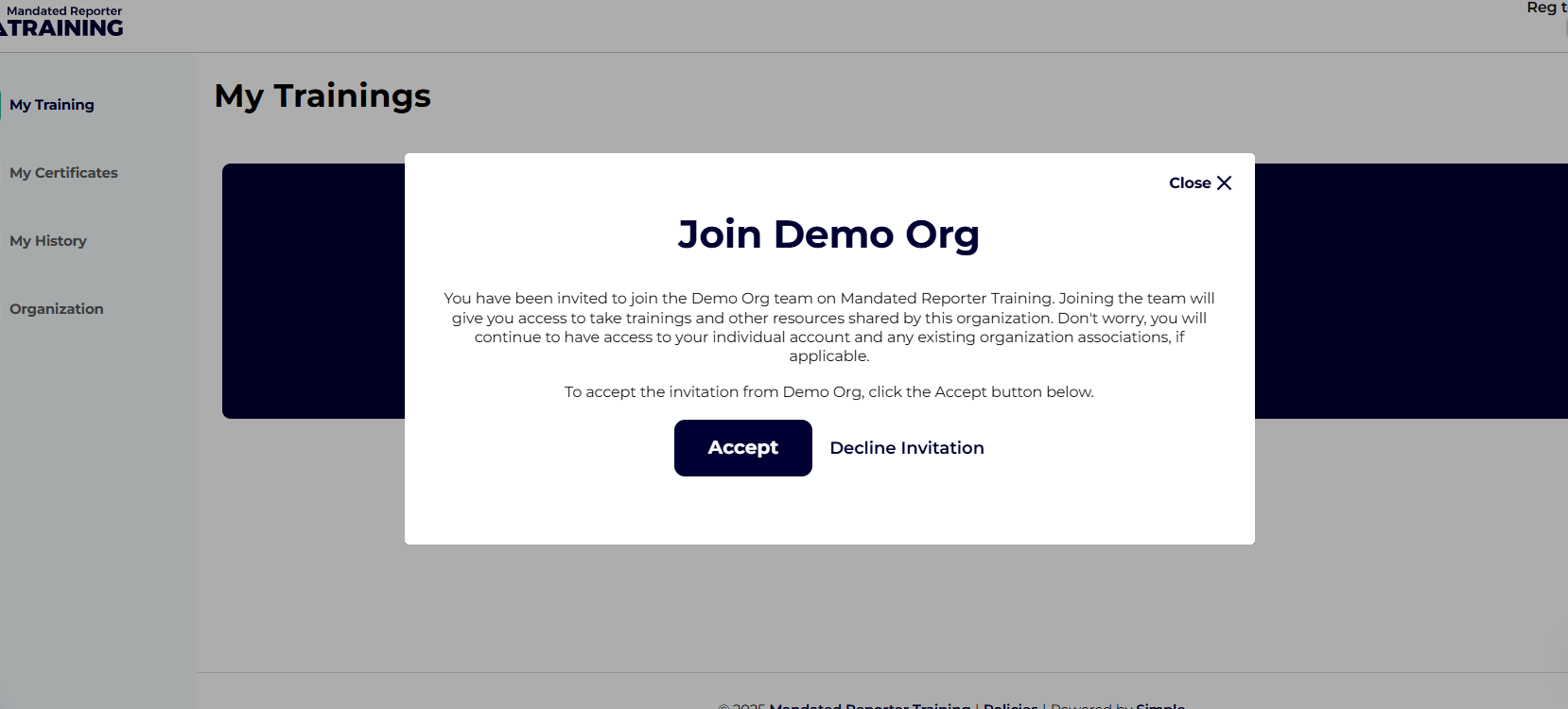 - After entering the code and logging in you will be automatically redirected to your Organization account. Be sure you are on your Organization account, whenever logging in. This ensures that your administrator can see your training progress.